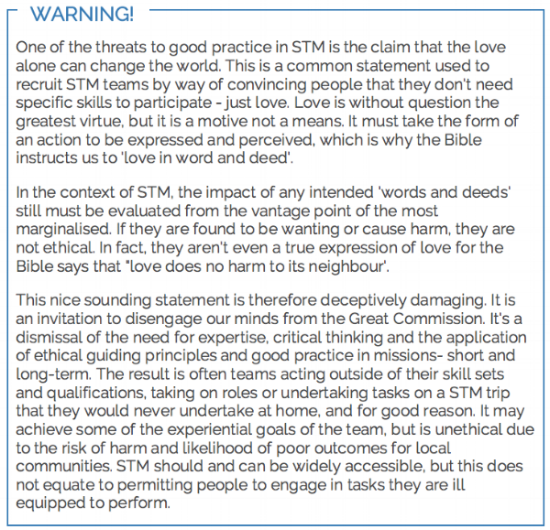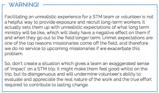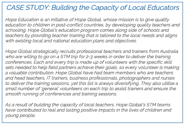 Another example is educating people about being wise with their giving to overseas programs. Often donors lack understanding of the root causes of these issues, which can result in funding being directed towards inappropriate responses that don't solve the real problems, and can in fact create new ones. Returning STMs can help educate donors (churches, individuals and businesses) and assist them to identify and direct their giving towards ethical and appropriate programs that address the real issues and don't result in harm.