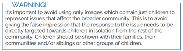 - ·Portraying of Children: Children’s situations often evoke particularly strong responses, however we must be careful not to exploit this and instead put the child’s best interests and safety first. Children should never be presented in a vulnerable or submissive manner. They should always be adequately clothed and private or sensitive information should not be made publicly available.